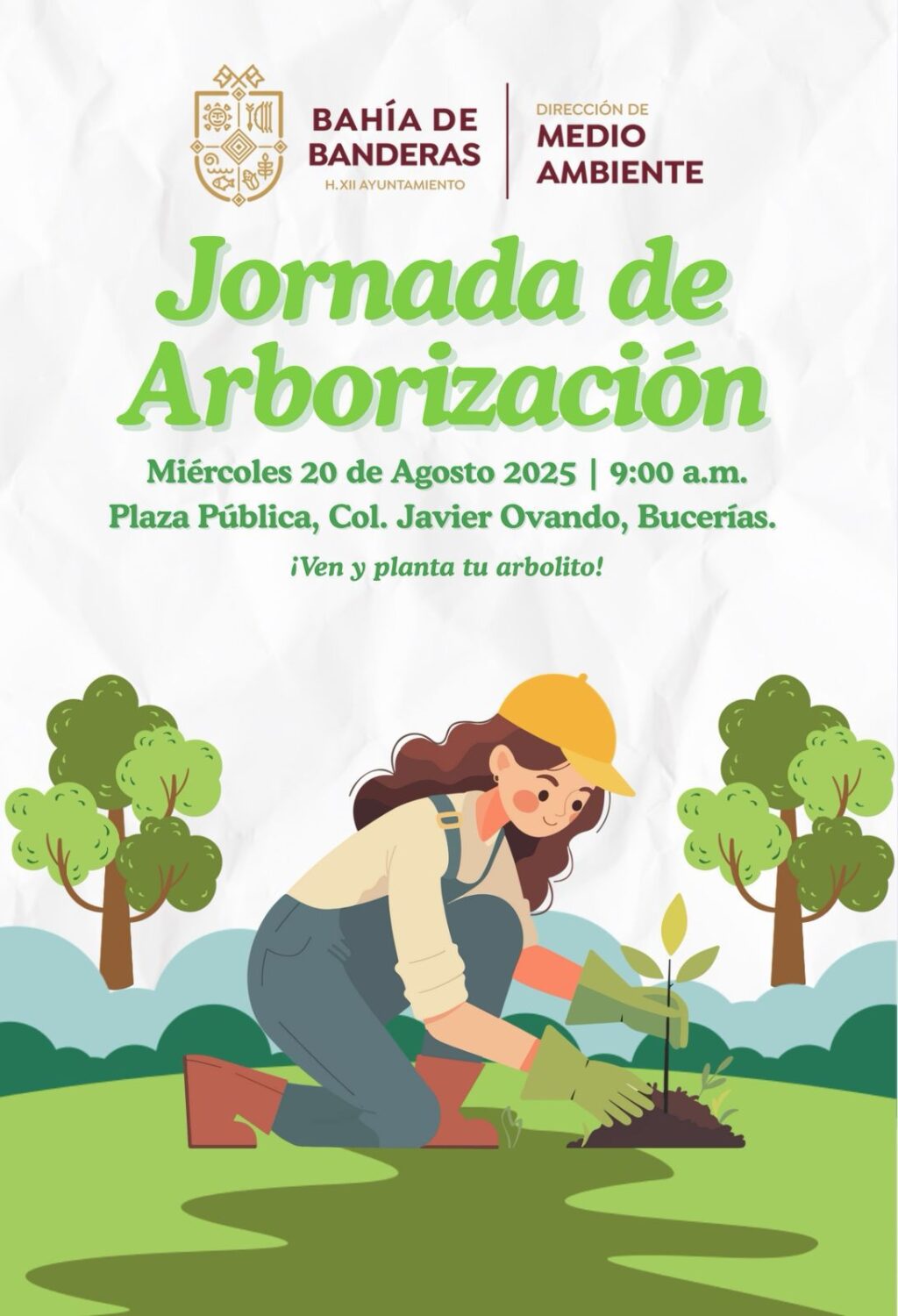 El H. XII Ayuntamiento de Bahía de Banderas, que encabeza el presidente municipal Héctor Santana, a través de la Dirección de Medio Ambiente, invita a la ciudadanía a participar en la Jornada de Arborización, que se llevará a cabo este próximo miércoles 20 de agosto, en punto de las 9am, en la Plaza Pública de la Colonia Javier Ovando, en Bucerías.